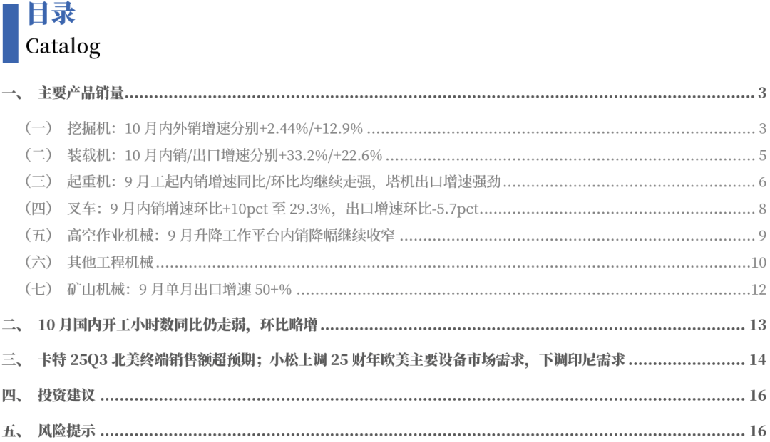 :10月发卖各类挖掘机18096台,此中国内销量8468台,同比增加12。9%。(2):10月发卖各类拆载机10673台,同比增加27。7%。此中国内销量5372台,同比增加33。2%;出口量5301台,同比增加22。6%。10月电动化率25。36%,环比+0。8pct,1-10月累计电动化率约23。1%,环比+0。26pct。其他产物:9月工起内销增速同比/环比均继续走强,塔机出口增速强劲;叉车内销增速环比+10pct至29。3%,出口增速环比-5。7pct;起落工做平台内销降幅继续收窄。10月国内开工小时数同比仍走弱,环比略增。协会数据,10月工程机械次要产物月平均工做时长为80。9小时,同比下降9。03%,环比增加3。62%;次要产物月开工率为55%,同比下降10。1个百分点,环比下降0。16个百分点。卡特25Q3终端发卖额超预期;小松上调25财年欧美次要设备市场需求,下调印尼需求。1)卡特彼勒:全年全球建建需求全体疲软,但卡特终端发卖额会增加,此中、非洲、中东区域将贡献增量;大型矿用卡车、铰接式卡车和大型履带式牵引车订单连结强劲增加。2)小松:FY25全球次要设备需求预测取7月根基分歧(下滑0-5%yoy),由降幅5-10%上调至降幅0-5%,租赁需求现恢复迹象;欧洲由降幅0-5%上调至持平;东南亚由降幅0-5%下调至降幅5-10%,次要因为印尼工程&矿山机械需求均疲软。我们认为,单10月挖机内销增速有所回落,国内挖机开工小时数和开工率同比仍走弱,但环比略增,陪伴保守发卖旺季到来,我们认为Q4挖机内销全体将连结稳健。9月各类工程起沉机内销增速同比/环比均继续走强,叉车内销增速环比+10pct至29。3%,高机内销持续2个月降幅收窄,非挖板块继续回暖;海外,库存消化、降息周期、财务货泉刺激下欧美苏醒向好。我们看好工程机械行业继续连结表里销共振向上的优良态势。宏不雅经济不及预期的风险,政策推历程度不及预期的风险,行业合作加剧的风险,出口商业争端的风险,汇率波动的风险。