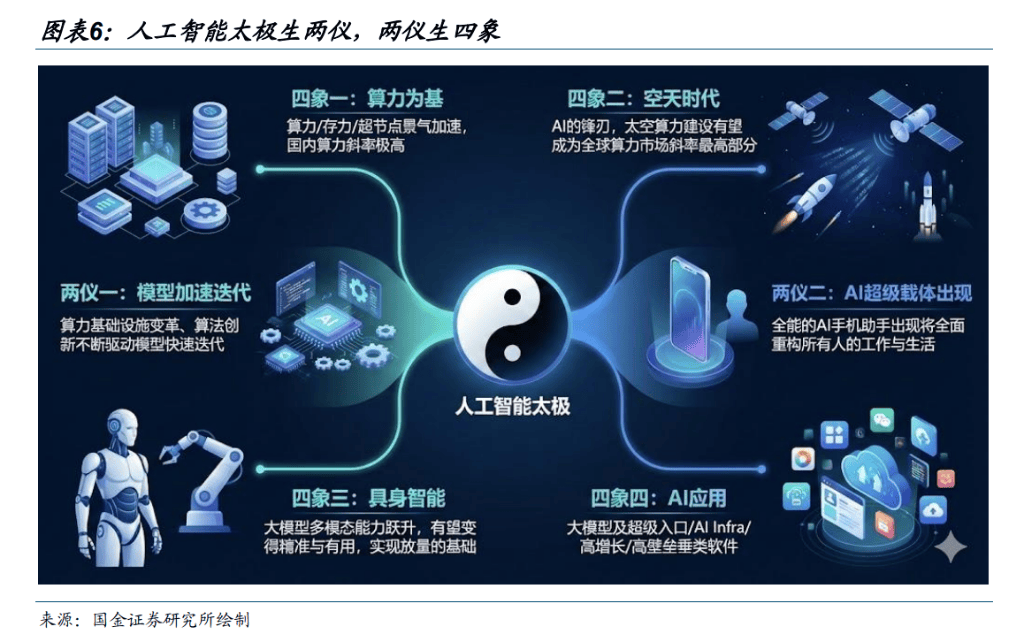 两仪已定,四象初生:算力为基,空天时代,具身智能,AI 使用出色不竭。模子的快速迭代取 AI 手机堆积数据流并具有智能会正在 2026 年鞭策 4 个范畴明白的投资机遇。1)算力的抢夺愈加激烈,且上限很是高。2)空天时代成为算力范畴合作最高的标的目的。3)机械人可能变得能听懂话,且连系施行多种使命。4)AI 使用渗入率临近轴量(5%~20%为新科技渗入率轴量区)。