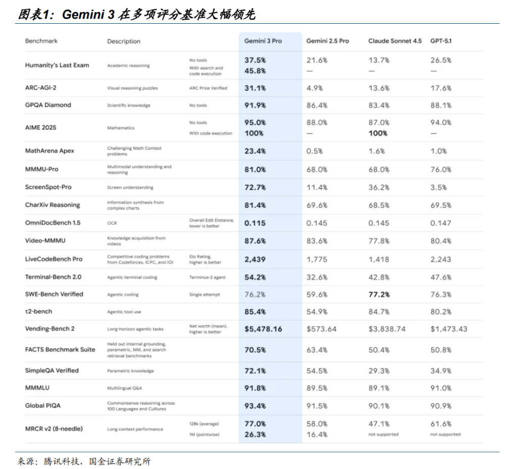 模子大脑侧,Gemini 3。0Pro 实现多模态理解能力跃升,将来机械人连系场景泛化使命从不成能变得可能。Gemini3 具有极强的多模态理解能力,正在 ScreenShot-Pro 评测基准中 Gemini3 Pro(得分 72。7%)大幅领先,是 Claude Sonnet 4。5 的两倍,GPT 5。1 的二个倍。空间推理能力的提拔,使模子可以或许更好地办事于从动驾驶、机械人、XR 设备和智能终端,加快具身智能。Gemini 3 Pro 能预测活动轨迹、理解物体关系并判断使命进度,为下一代从动化系统奠基根本,也是面向实体机械人的环节一步。将来从“—决策—步履”的同一:模子学会正在屏幕上识别按钮并操做,取机械人识别现实中的物体并完成抓取,正在底层逻辑上是相通的,这一能力也可天然扩展到对实正在设备和复杂操做界面的理解取节制。我们认为将来机械人能理解多种人类指令,连系场景完成泛化使命从不成能变得可能,这是具有智能实正效量的根本。