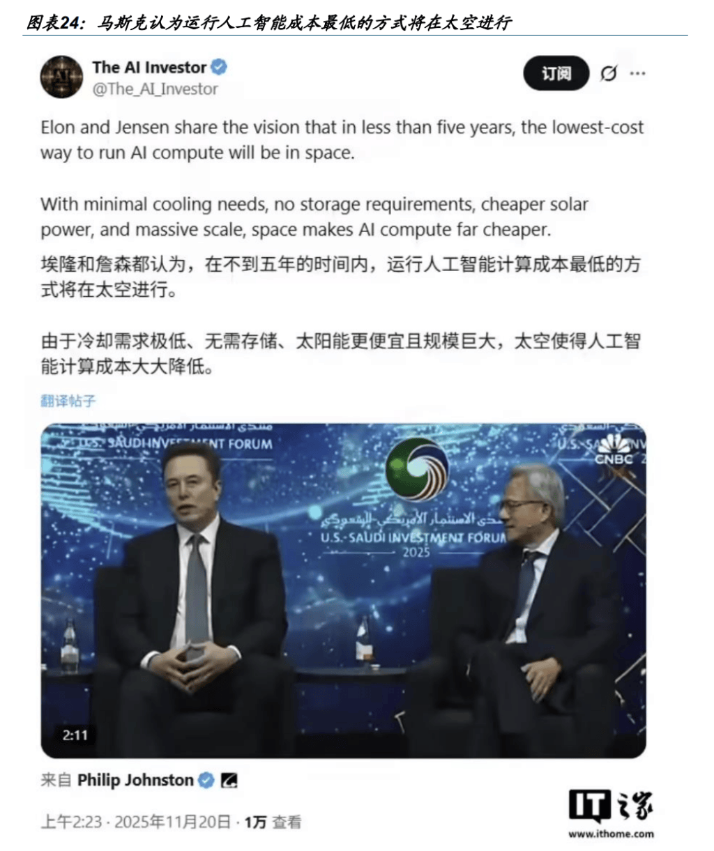 谷歌披露“Project Suncatcher”,进军太空算力。按照华尔街,谷歌披露了名为“Project Suncatcher”的打算,旨正在建立一个由太阳能驱动的太空数据核心原型。该项目并不是成立一个单一的轨道巨石,而是由 81 颗搭载 AI 芯片的卫星构成的集群。它们将正在太空中协同飞翔并处置数据。做为该打算的第一步,谷歌将取卫星公司 Planet 合做,估计于 2027 年向远地轨道发射两颗原型卫星。此举的焦点逻辑正在于操纵太空奇特的劣势——出格是太阳同步轨道供给的近乎恒定的太阳能,以及光正在地面扶植所需的地盘和水资本。对于投资者而言,这了一个明白的信号:虽然面对物理世界的,科技行业仍试图证明 AI 具备无限的可扩展性。若是 Gemini 等 AI 模子的查询可以或许正在太空中处置并将成果传回地球,将完全改变其力根本设备的成本布局取能源依赖。