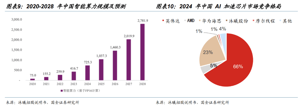 智算核心持续扩容,国产替代加快。按照 IDC 数据,2020 年中国智能算力规模为 75。0 EFLOPS,到 2028 年估计将达到 2,781。9 EFLOPS,估计 2020-2028 年复合增加率达到 57。1%。跟着地缘严重场面地步鞭策中国企业寻求当地替代方案,以及国产芯片手艺的稳步提拔,国内云办事供给商正正在加快建立并构架焦点(将分歧类型的芯片连系利用,如 CPU、GPU、国内替代芯片)。例如,腾讯云已将其异构计较平台全面兼容所有支流国产芯片,以满脚内部开辟和客户对 AI 算力的需求。按照 Bernstein Research,2024 年中国 AI 加快芯片市场中,英伟达、AMD 市场份额别离为 66%、5%,合计占比达 71%。但受益于国产替代趋向及供应链平安需求,国内计较芯片公司正敏捷提拔。此中,华为海思/沐曦/摩尔市场份额已别离达到 23%/1%/1%。