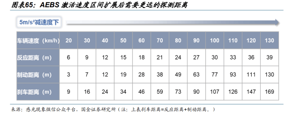 对于 AEBS 激活速度区间的扩展现实上是对传感器探测距离的更高要求。以 5。0m/s² 速度计较,80km/h 速度行驶的汽车至多需要约 73m 的刹车距离,而当车速达到 130km/h 时,这一距离扩展至 169m。