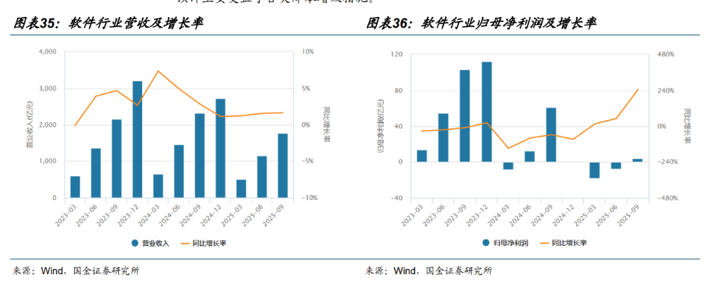 计较机行业根基面已于 2025H2 见底回升,具备反弹前提。按照 Wind 软件指数(882250。WI),能够看到,软件行业营收已于 2025H2 见底回升。此中 2025Q3,行业停业收入 1765。19 亿元,同比增加 1。61%。收入端全年维稳、迟缓修复;归母净利润 3。77 亿元,同比增加 244。56%,估计次要受益于各类降本增效办法。