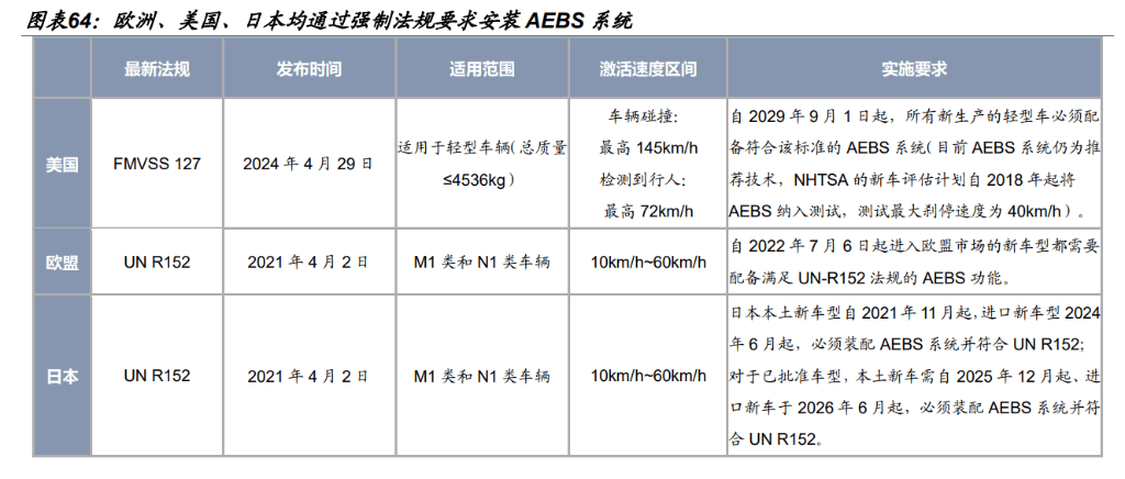 全球范畴内,欧洲、美国、日本均已通过相关律例要求正在分歧程度上强制要求安拆AEBS系统。1)24年4月,美国发布FMVSS127,要求自2029年9月1日起,所有新车发生的轻型车必需配备合适该尺度的AEBS系统(目前AEB系统仍为保举手艺,NHTSA的新车评估打算自2018年起将AEBS纳入测试)。2)21年4月,欧盟发布UNR152,要求自2022年7月6日起进入欧盟市场的新车型需配备满脚UN-R152律例的AEBS功能。3)2020岁尾,日本颁布发表本上新车型自2021年11月起,进口新车型2024年6月起,必需拆卸AEBS系统并合适UNR152;对于已核准车型,本上新车型自2025年12月起,进口新车于2026年6月起,必需拆卸AEBS系统并合适UNR152。