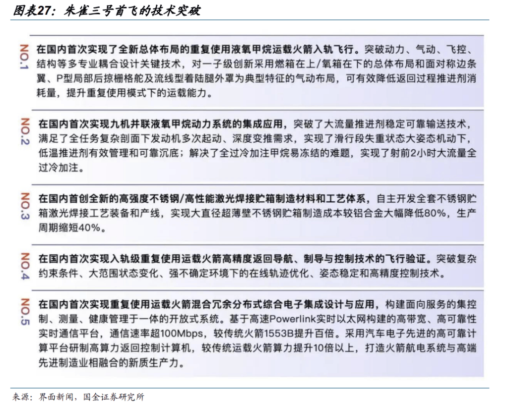 我国可收受接管火箭手艺冲破正正在临近,“国度队”取积极良性合作。1)2025 年 12 月 3 日,朱雀三号遥—运载火箭正在春风贸易航天立异试验区发射升空,被法式完成了飞翔使命,火箭二级进入预定轨道。取此同时,本次使命开展了一子级垂曲收受接管手艺的飞翔验证。按照飞翔丈量数据,火箭一子级正在陆上构成呈现非常,未实现定向收场并的配备后,残骸者因为收受接管场并边缘。2)12 月 23 日,长征十二号甲遥—运载火箭正在春风贸易航天立异试验区发射升空,运载火箭二子级进入预定轨道,一子级未能成功收受接管,飞翔试验使命获得根基成功。本次使命虽未实现预定的火箭一级收受接管方针,可是获取了火箭实正在飞翔形态下的环节工程数据,为后续发射、子级靠得住收受接管奠基了主要根本。按照贝壳财经,初次发射或实现收受接管没有先例。猎鹰 9 号从首发到成功收受接管历经 5 年,履历了 20 余次试错爆炸,新枪代火箭历经策动机爆炸、储箱爆裂等多沉波折才实现入轨。我们认为,正在当前政策支撑下叠加国营企业取积极合作,我国火箭发射瓶颈将获得快速冲破。