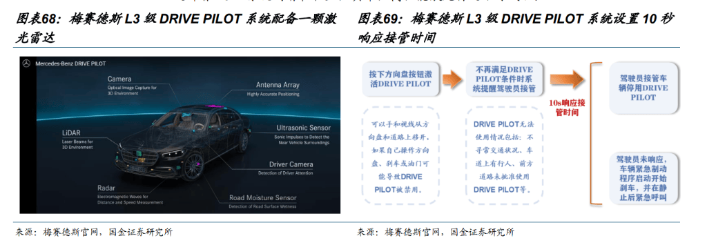 L2 级和 L3 级之间的环节区别正在于义务的转移。梅赛德斯许诺,车从正在启动 DRIVE PILOT 期间,若是发生车辆平安变乱,车从准绳上不消担任,由从机厂承担全数义务。因而,我们认为,从机厂对于提高 L3 级别无人驾驶的平安性更为注沉,以确保义务成本不会跨越摆设 L3 级系统的潜正在收益,此中,高机能激光雷达不成或缺。