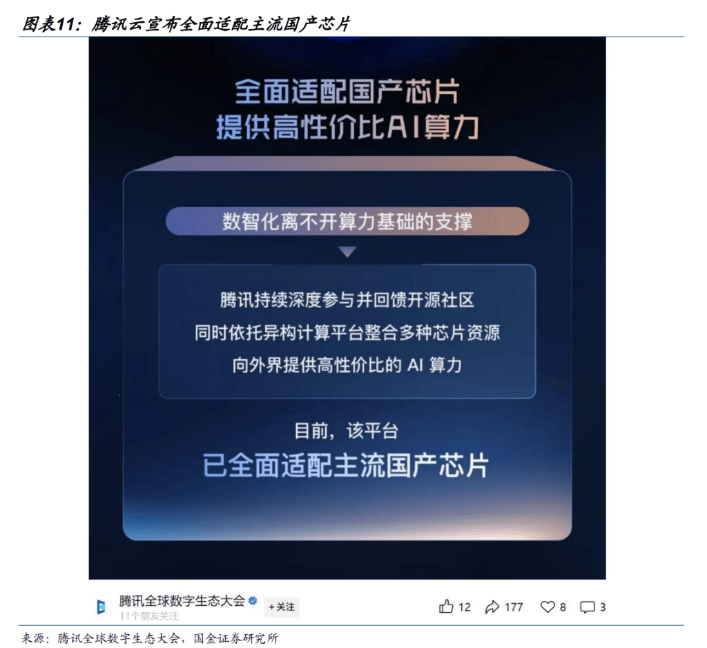 CSP 厂商加快制配,帮力国产芯片生态扶植。英伟达的 X86 生态、英伟达的 CUDA 生态之所以难以撼动,焦点正在于构成了“芯片-软件-使用”的闭环。而当前国产阵营中,华为野腾、阿里早甲等,壁切科技等芯片厂商各有手艺线,生态分离问题显著。腾讯集团高级施行副总裁汤道生正在交换中坦言,分歧参数规模的 AI 模子需要适配分歧芯片设置装备摆设,当前只能通过取多家厂商合做实现场景笼盖。百度、阿里等企业加快制配国产芯片,鞭策“芯片-模子-使用”闭环构成。