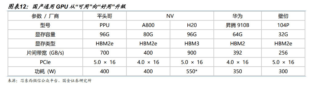 国产通用GPU从“可用”向“好用”升级。国产GPU正在机能目标、软件生态、使用适配等方面取NV最先辈一代仍有差距,但已根基适于H20、A100等,且正在当地化办事、政策支撑、成本节制等方面具备劣势。跟着本钱持续注入,国产企业无望正在细分场景实现冲破,逐渐扩大市场份额。1)算力目标上:国内大都头部企业支流正在售产物的FP16/BF16正在100-300 TFLOPS摆布,处于英伟达A100产物阶段,少数厂商通过先辈封拆等体例实现接近英伟达H100产物的算力,为国内最先辈程度;2)显存方面:国内企业连系本身产物特点,别离选择HBM2e、HBM2、DR等显存类型,显存带宽正在0。5-2 TB/s摆布。