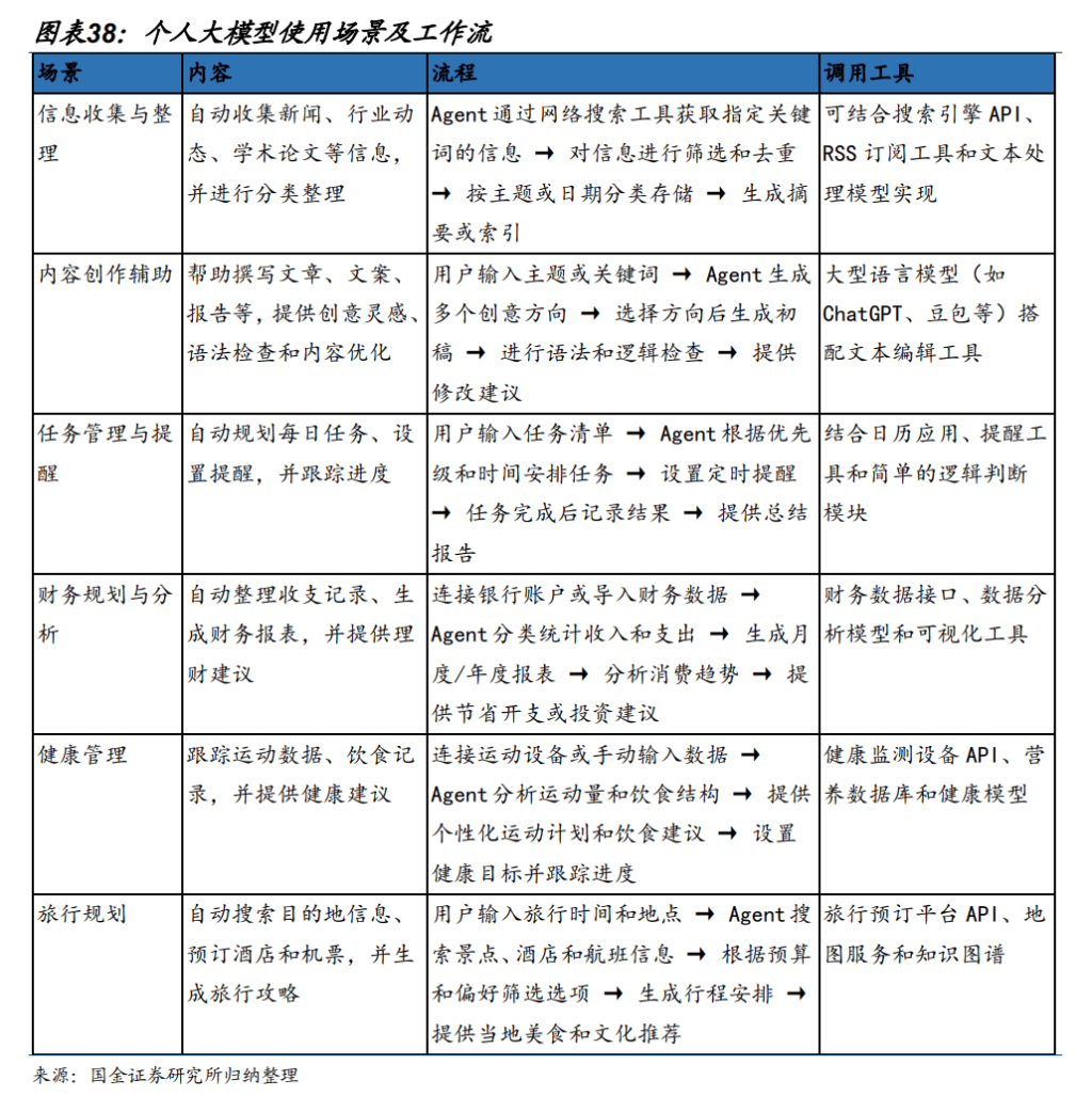 正在利用大模子过程中,用户可将其取小我学问库及工做流深度连系。1)大模子利用场景远不止对话及搜刮,用户可操纵大模子为本人设想和搭建的从动化、智能化工做流程,旨正在提高效率、简化使命实现特定方针。2)按照日常的工做糊口,工做流可包罗消息收集取拾掇、内容创做取辅帮、使命办理取提示、财政规划取阐发、健康办理、旅行规划等。比拟通用 AI,自定义 Agent 能够利用者小我的学问库及工做流深度连系,通过多次利用取反馈,Agent 的个性化及效益程度可持续提拔。